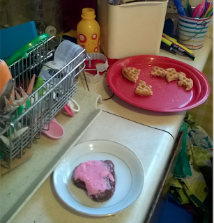 And I'm totally not posting this so that people will write "That looks awesome Rach! Seriously, I like yours better than Spark Mom's because it's charming and real." Well I wouldn't mind that I guess, but I'm mainly posting it because lately I've been having this reaction in so many areas -- projects I do with the kids, home "design" if you could call it that, art journaling, pathetic, pathetic attempts at art journaling. I don't seem to have any natural aesthetic sensibilities and I can't execute things well, either. Plus there is just the everyday chaos of things that many mom blogs and pinterest pins don't show. Like what if I featured the Valentine brownie with this background? With the waffle Petra said she wanted then didn't eat, with the pens that shouldn't be in the kitchen, Wally's water bottle, the pacifier that hasn't been used in years and probably has mold.